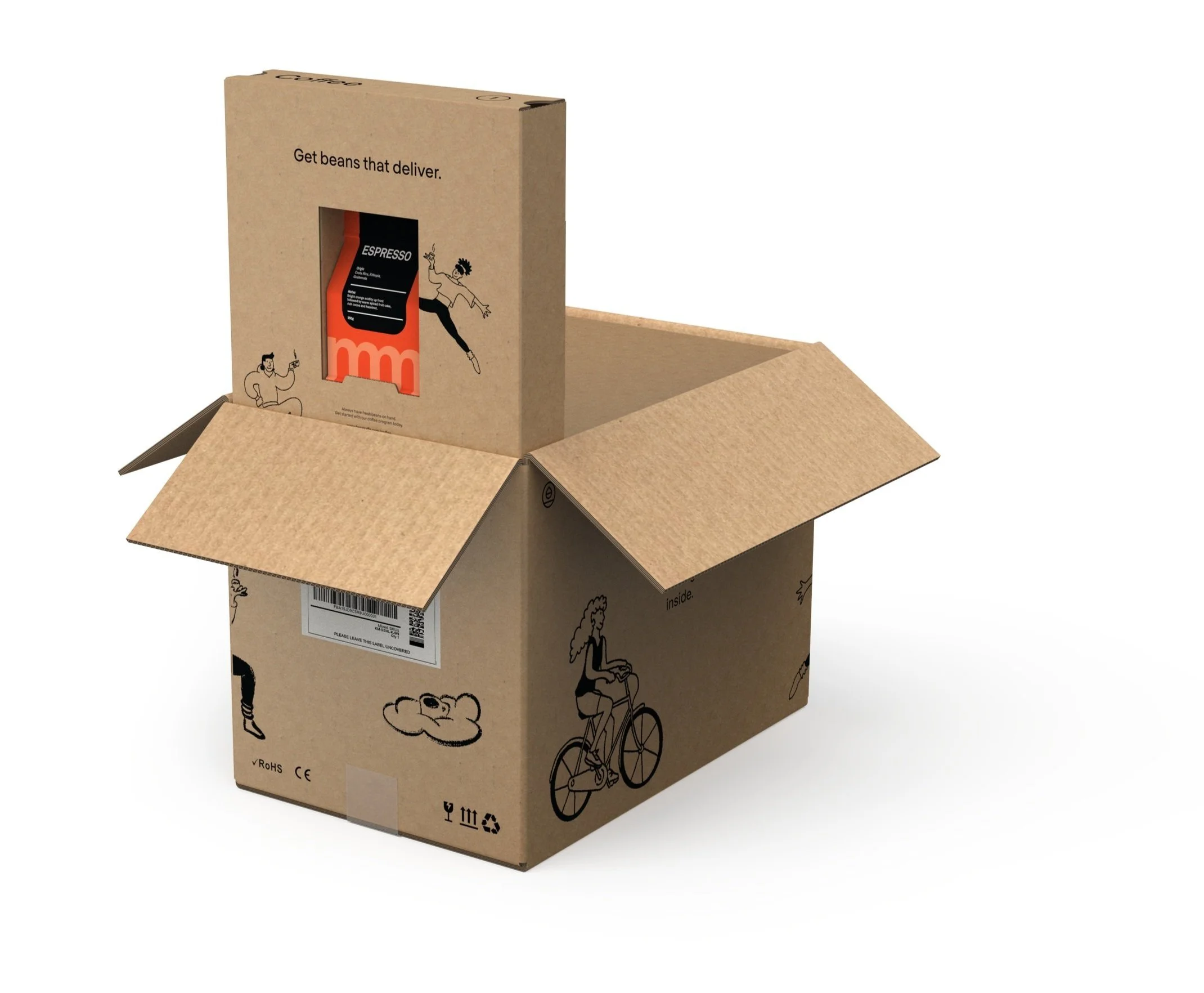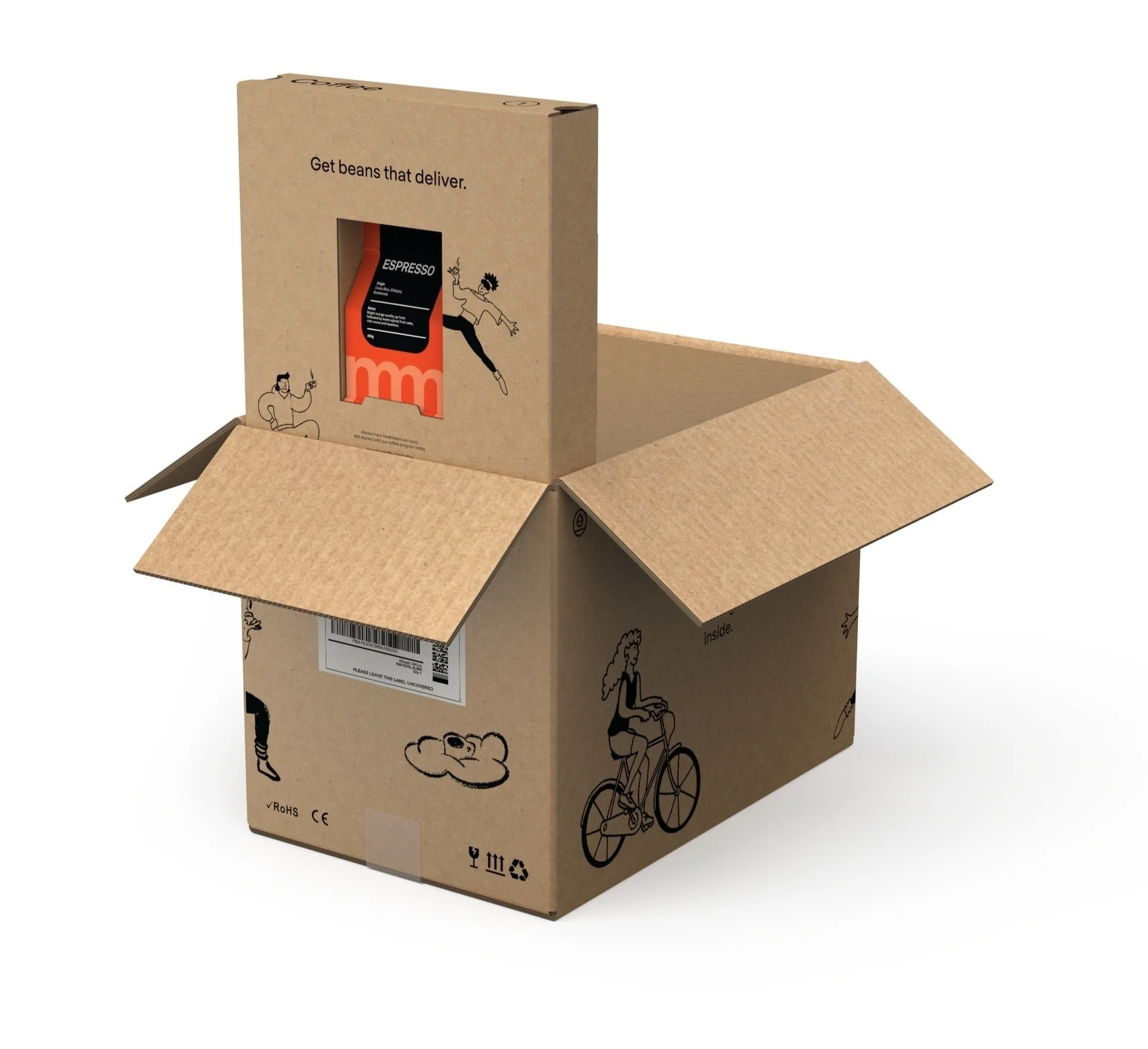 To surprise and delight customers during the unboxing process, a bag of coffee selected at checkout is included in the same box as their TK-02. Making this possible required a thorough understanding of the supply chain process and coordination with packout teams. An external “coffee pocket” and internal coffee bag insert were designed to accommodate this addition. The side-loading external door (coffee pocket) was created to customize the secondary shippers with a unique bag of beans while keeping them palletized. The door is sealed with an artwork label, and the TK-02 is ready to be shipped with everything needed for costumers to start brewing.